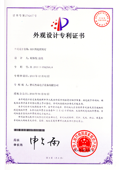 LED四孔照明燈外觀(guān)設計專(zhuān)用證書(shū) |