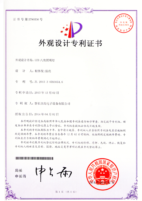 LED八角照明燈外觀(guān)設計專(zhuān)用證書(shū) |