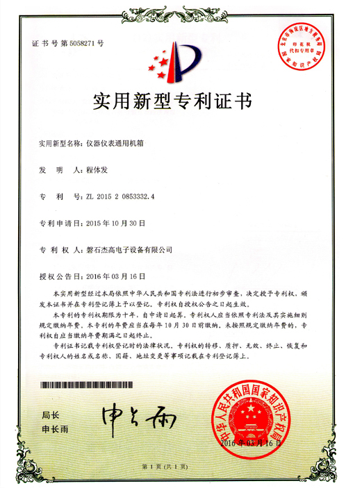 儀器儀表通用機箱實(shí)用新型專(zhuān)利證書(shū)B(niǎo) |